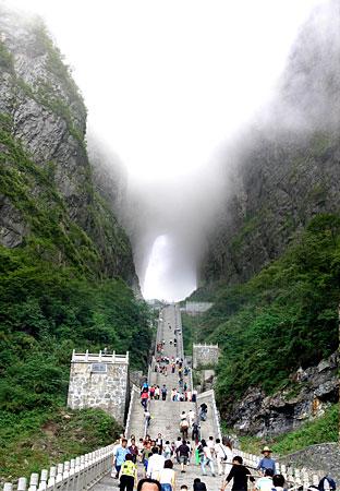 天門山是張家界海拔最高的山,因自然奇觀天門洞而得名。天門山古稱嵩梁山,三國時(shí)期,嵩梁山一峭壁忽然裂開,宛如一扇門,吳帝覺得這是吉兆,于是嵩梁山也由此易名天門山。