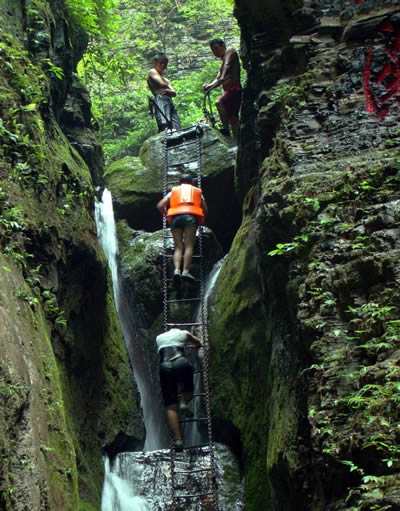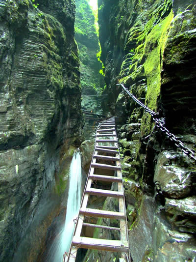 坐龍峽風(fēng)景區(qū) 坐龍峽擁有中國(guó)第一條特種游道。所有游道均建于峽谷深處,依山取勢(shì),既經(jīng)細(xì)心雕琢聽卻又渾然天成。粗樸的板栗木棧道,可以讓你零距離的親近那一潭碧幽、聽聞山泉叮咚;精巧的跳墩,可以讓你媳戲流泉、觸感溪瀑;原質(zhì)的石坎道,讓你不得不調(diào)動(dòng)全部的身心能量悉心攀援、感悟峽谷;有驚無險(xiǎn)的鐵梯,讓你伴著腳下轟鳴的溪水,在驚怵中體味一份快慰。出口處的土家山寨,保留了古樸獨(dú)特的生活習(xí)俗。一塊臘肉就一口醇香的“苞谷燒”會(huì)讓你洗去所有的疲憊,在輕松中憨厚的主人向你講述過去強(qiáng)人出沒的故事......