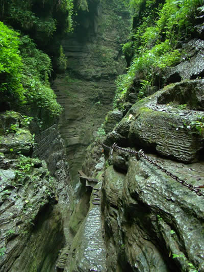 坐龍峽圖片 坐龍峽風(fēng)景區(qū)位于古丈縣河西鎮(zhèn),與“芙蓉鎮(zhèn)”--王村一水之隔。經(jīng)由300萬(wàn)年大自然的風(fēng)吹、水蝕而成,一直隱逸于湘西茫茫十萬(wàn)群山之中。它長(zhǎng)約3500米,最大高差達(dá)300余米;寬處不足丈余,窄處僅容一人通過;谷內(nèi)絕壁縱疊,溪瀑橫懸,崖樹斜逸,異草遍坡。