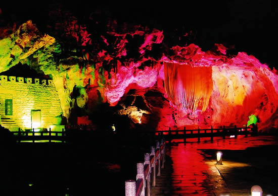 | 奇梁洞位于縣城北四公里處,屬典型的碳酸鹽巖洞,該洞以奇、秀、闊、幽四大特色著稱。洞長6000余米,共分五大景區(qū):即古戰(zhàn)場、畫廊、天堂、龍宮和陰陽河。洞中有山,奇梁洞圖片山中有洞,洞洞相連。它集奇巖巧石,流泉飛瀑于一洞,由千姿百態(tài)的石筍、石柱、石鐘乳構(gòu)成了一幅幅無比瑰麗的畫卷。一條小溪穿洞而過,水流平緩,燈光打在巖壁上,皺襞倒影在水中,如夢如幻。巖洞用五光十色的霓虹燈打在石筍、石幔及石花上,營造出一個流光溢彩的世界。在洞內(nèi)有一大廳,據(jù)傳是苗民糾集的地方,廳里立著一塊帶一個小孔的石頭,對著小孔“嗚嗚”地吹,整個大廳會回蕩著低沉的號角聲,當年的苗民就是用這種方式傳令的。