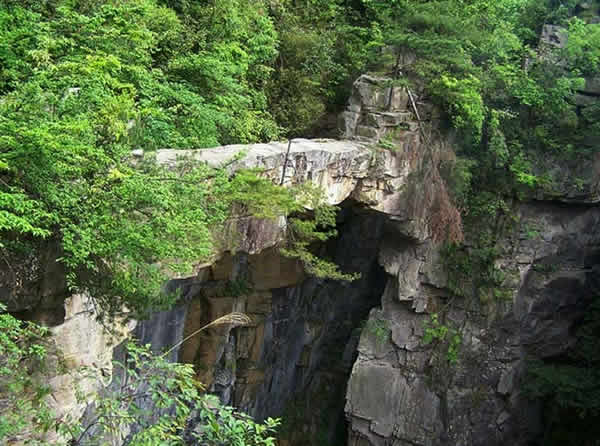 仙人橋又稱天下第一橋,坐落在猴子坡上、天子峰下的王爺洞對(duì)面。橋?qū)僮匀恍纬桑L(zhǎng)26米,寬1.5米,厚一米多,高約六七十 米,飛架在兩岸懸崖絕壁之上,鬼斧神工,惟妙惟肖,古人云:“天地可掬,此真天造也”。仙人橋?yàn)榧t砂巖結(jié)構(gòu),兩端生有高大的黃山松和杜鵑樹,濃蔭掩映,極其美麗。橋的東頭還有自然形成的石級(jí),人可順石級(jí)而下,走上天橋,下視萬(wàn)丈深淵,令人頭暈?zāi)垦,非健壯者不敢逾越,旅游者無(wú)不贊嘆,說(shuō)它是“天下絕景”。