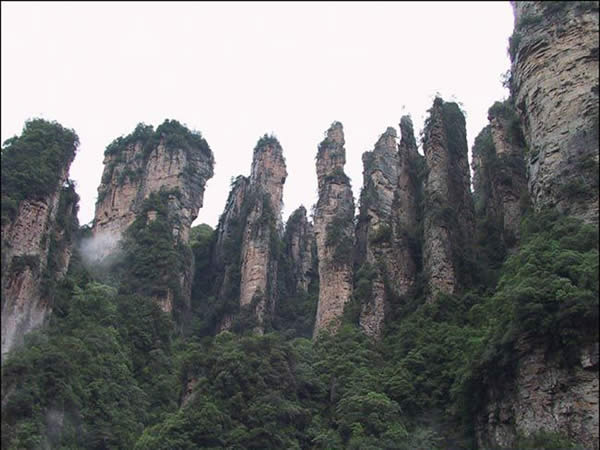 從仙人橋去老屋場(chǎng),但見(jiàn)深谷里密密麻麻羅列上百座石峰,活像一群威武雄壯的將士列隊(duì)聽(tīng)令,相傳這是向王天子的神兵在聚會(huì)。神話雖不可靠,但石峰如此集中壯觀,在武陵源也屬罕見(jiàn)。我想引用一位美術(shù)大師的話:“豈有此理,莫名其妙,說(shuō)也不信,到此方知”。不看神兵聚會(huì),怎知石峰成林。