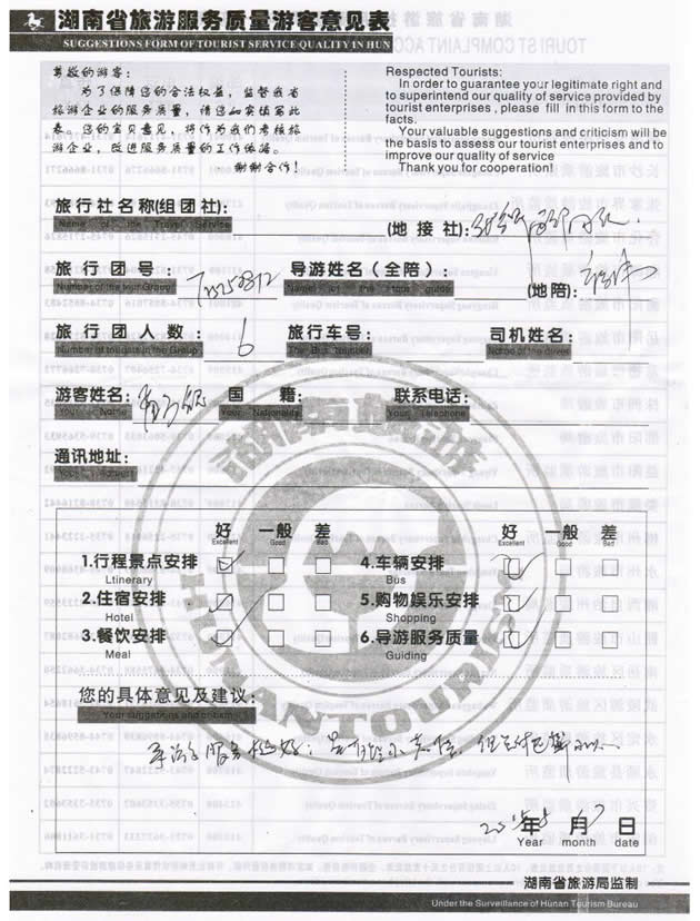 8月初,山西太原孟先生一行6位貴賓與湖南西部(張家界)中國(guó)國(guó)際旅行社工作人員——小吳取得聯(lián)系,經(jīng)過商談,雙方達(dá)成協(xié)議并簽訂旅游合同,于8月14日抵達(dá)張家界,開始張家界之旅。此次行程是由我社優(yōu)秀導(dǎo)游——褚偉負(fù)責(zé)旅游接待工作,褚導(dǎo)在旅游過程中講解詳細(xì),客人也很滿意,在意見表上寫道:導(dǎo)游服務(wù)挺好,謝謝周先生。同時(shí)也感謝周先生選擇湖南西部(張家界)中國(guó)國(guó)際旅行社,以及您對(duì)湖南西部國(guó)旅的信任與支持。我們會(huì)繼續(xù)努力,做好旅游接待工作。期待下一次與您的合作,祝您愉快!
