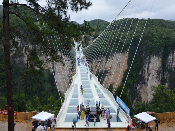 上 午:早餐后07:30至08:00 準(zhǔn)時(shí)統(tǒng)一集合乘車赴“小九寨溝”之美譽(yù)的張家界大峽谷景區(qū)。(車程約60分鐘)【張家界大峽谷+玻璃橋B線】(門票已含),(已含首道門票,含游船費(fèi),游覽時(shí)間約3個(gè)小時(shí)),零距離接觸張家界“奇峰三千,秀水八百”的神奇瑰麗。觀天仙水瀑布、蝴蝶泉瀑布、竹仙泉、翠潭攬瀑;行于一線天、天梯棧道、石壁裂縫、石上森林;探怪謎洞、佛手遮天、爛船巖千古流傳的未解之謎;谷中猴群歡躍,百鳥爭(zhēng)鳴,湖水清澈、群山倒蘸 ,鴛鴦戲水、空氣清新、絕無僅有。形態(tài)各異的瀑布群,把生命之源傾瀉得淋漓盡致;隨海拔變化的植物帶,將四季更替演繹得如詩如歌;數(shù)條彩虹,百米梭板,千年風(fēng)情,萬米長(zhǎng)廊,把峽谷內(nèi)裝扮得如畫似錦。體驗(yàn)世界最高最長(zhǎng)首座斜拉式高山峽谷玻璃橋【云天渡】,漫步天上人間、輕吻藍(lán)天白云、帶上你的心靈從這頭走到那頭、走過青絲到白發(fā)!挑戰(zhàn)極限,戰(zhàn)勝自我(上橋游覽時(shí)間為20-30分鐘);(玻璃橋游覽注意事項(xiàng):1、遇大風(fēng)、暴雨等極端惡劣天氣,玻璃橋有可能關(guān)閉,關(guān)閉不能通行時(shí)不退任何費(fèi)用;2、除錢包和帶有手機(jī)套的手機(jī)外,任何物品不得帶上橋;3、凡有心臟病、高血壓、恐高癥及醉酒和其他身體不適宜游覽的,請(qǐng)勿上橋;4、穿高跟鞋的游客不允許上橋;5、不得在橋上追逐、打鬧,拋物,不得倚靠橋上欄桿,以防身體傾斜,發(fā)生意外。6、游客在游覽過程中請(qǐng)聽從景區(qū)工作人員管理)!